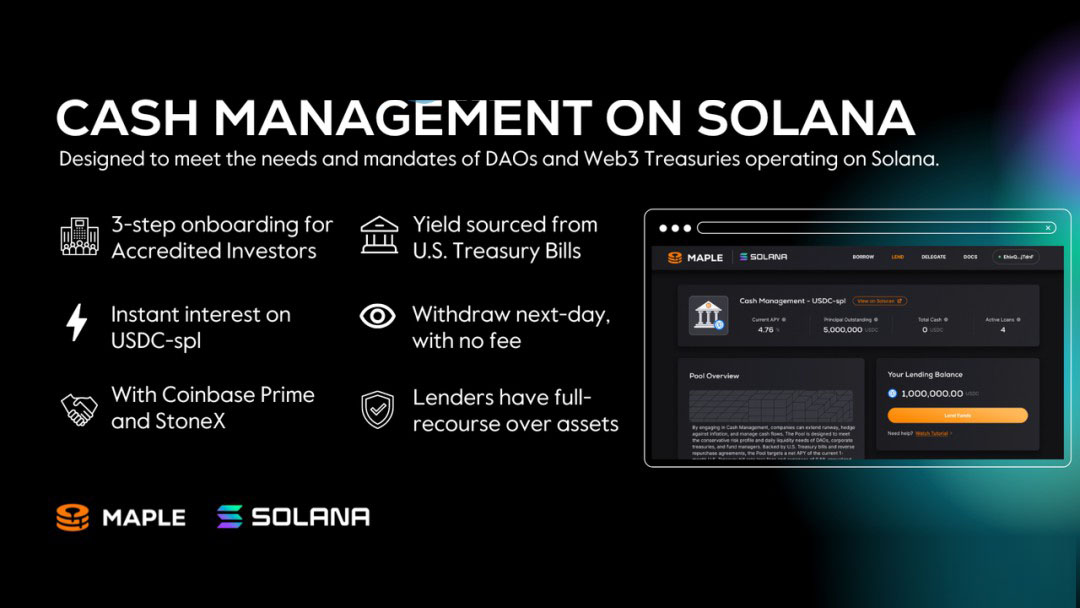 2023 年 5 月,Maple 推出了资管方案 Maple Cash Management Pool,靠国债收益为用户提供 4.8% 左右的净 APY,可以根据需要自由进出池,而无需支付锁仓或赎回费,成为 Solana 生态首个国债类 RWA。现在产品已被拓展为 USDC 借贷,但考虑到其在 Solana 生态的开创性作用, 也记录在本文中。