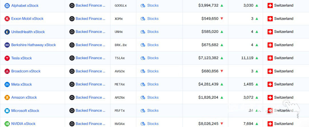 xStockxStocks 是由 Backed Finance 推出的代币化股票产品,几乎占据了 Solana 代币化股票的整个江山。上线一个月,Xstock 链上总交易量就突破 3 亿美元,充分证明了市场对股票代币化的需求。