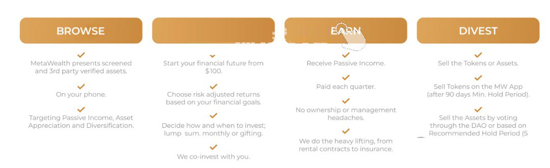 MetaWealth 与第三方质量评估机构完成审计和调研后,将合格房产收购并出租,同时将将房产的所有权碎片化,使得用户可以以最低 100 美元的低门槛参与投资,并根据投资占房产总价的份额分取租金。