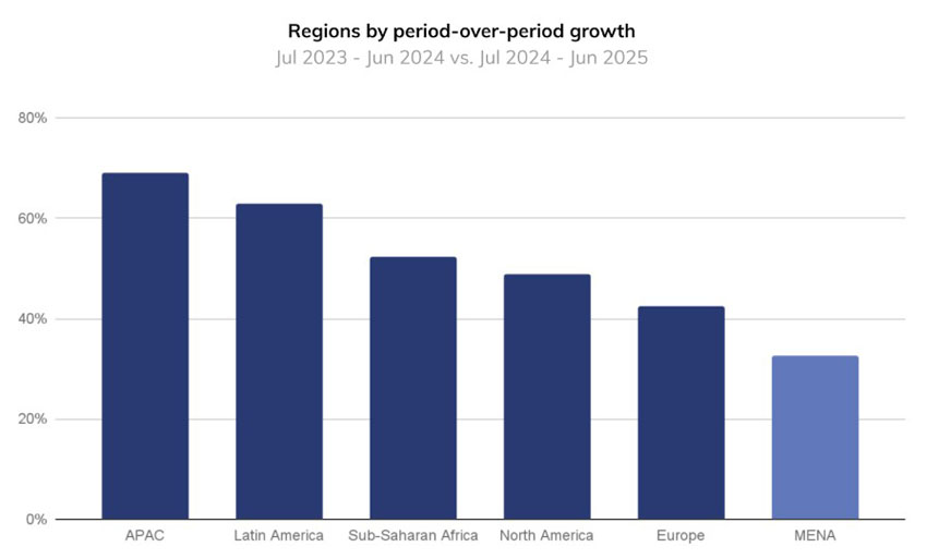 据Chainalysis称,MENA地区同比增长33%,落后于亚太(APAC)地区的69%和拉丁美洲的63%,后两者是全球增长最快的地区。