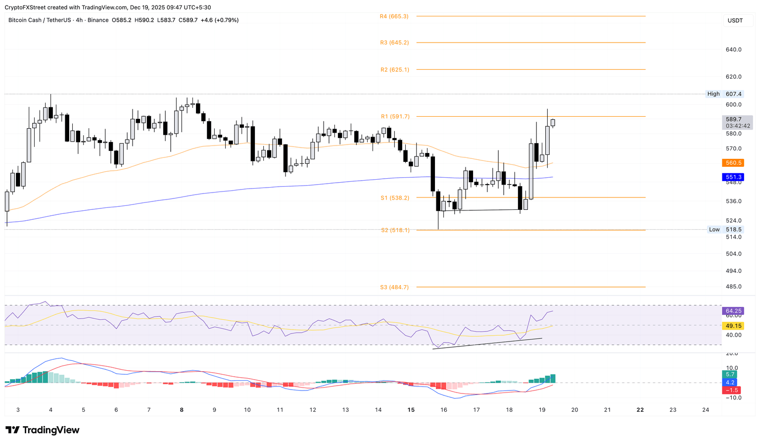 比特币现金在从 530 美元形成双底反转后,BCH 在 4 小时价格图表上突破了 50 周期和 200 周期指数移动平均线 (EMA)。BCH 正缓慢向 591 美元的 R1 枢轴点迈进,目标是在该点上方收盘。